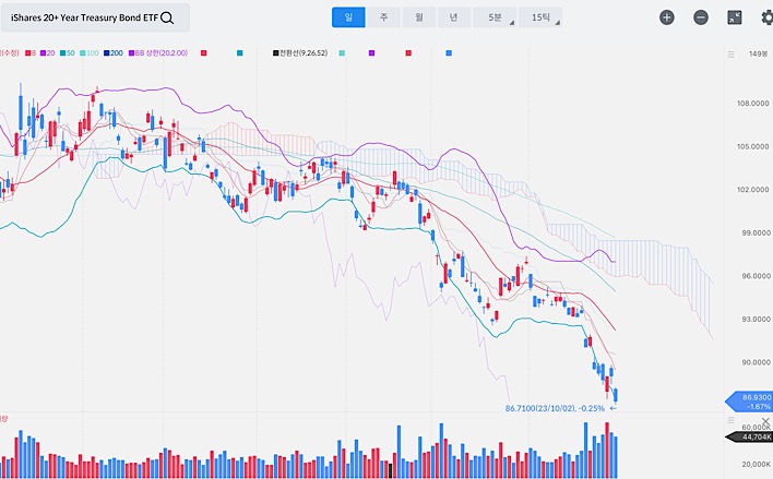 금리 인상은 채권 가격과 TLT에 부담을 주고 있습니다. 2022년 3월부터 연방준비제도는 단기 연방금리를 0.125%에서 4.875%로 인상했습니다.