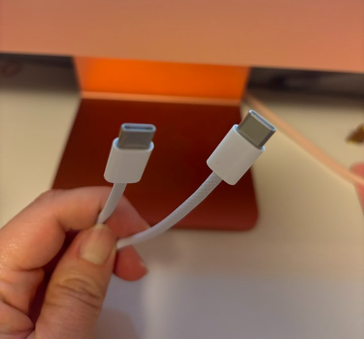 준비한 어댑터를 사용하여 아이패드와 아이맥을 연결합니다. 아이패드와 아이맥 모니터간의 연결은 케이블을 통해 이루어집니다. USB-C to USB-C 케이블을 사용하면 편리합니다.