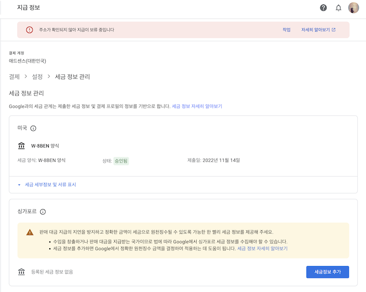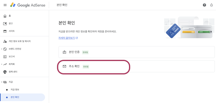 지급정보 창에 지급보류 메세지가 떠있습니다. 자세히 알아보기를 클릭하면 관련하여 입력이 필요한 화면으로 연결됩니다. 본인확인 섹션에서 주소 확인을 클릭합니다. 우편물을 확인하고 PIN 번호를 입력한뒤 정상처리 됨을 확인하기 위해서는 아래와 같이 주소 확인 창에 완료됨을 체크하면 됩니다.