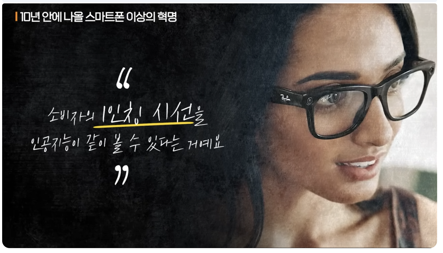 AI 시대의 디바이스: 스마트폰을 이을 'AI 디바이스'가 필요하며, 메타의 스마트 글라스처럼 소비자가 이미 거부감이 없는 안경 형태가 유력하다고 언급합니다. 안경에 달린 카메라는 사용자의 1인칭 시선을 AI에게 제공하여, 검색 기반이 아닌 '현재 경험 기반'의 정확한 추천(니즈의 70~80%는 보고 경험하는 것에서 발생)을 가능하게 합니다.