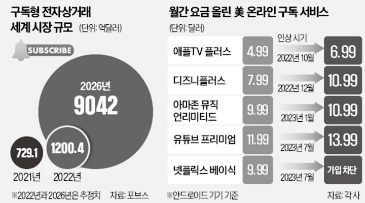 디즈니플러스는 지난해 12월 상품을 이원화했습니다. 월 7.99달러(1만 200원) 상품은 광고를 봐야 합니다. 광고를 없애려면 10.99달러(약 1만 4000원)를 주고 프리미엄 서비스를 이용해야 하고 애플 TV 플러스도 지난해 10월 4.99달러(약 6400원)에서 6.99달러(약 8900원)로 가격을 40% 올렸습니다. 음원 플랫폼인 스포티파이 역시 10년 만에 월간 요금을 9.99달러에서 10.99달러로 올리기로 결정하며 인상 대열에 합류했습니다.